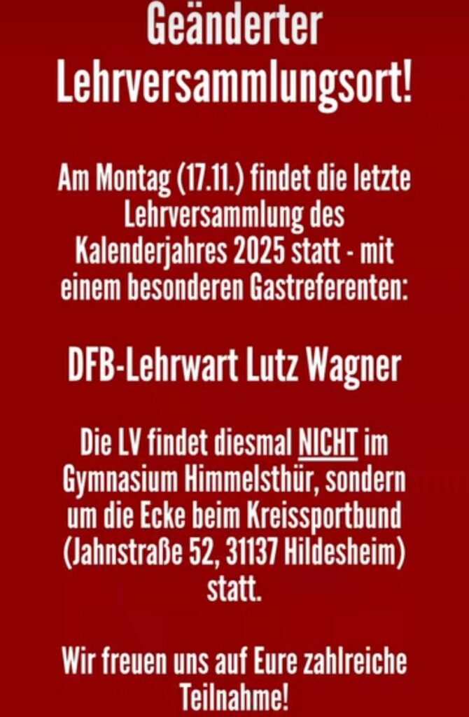 Am Montag, 17. November, wird die letzte Lehrversammlung 2025 stattfinden. Wir bekommen mit Lutz Wagner einen der führenden Schiedsrichter-Ausbilder in Deutschland zu Besuch. Er wird mit Sicherheit viele interessante Informationen und auch viele Anekdoten mitbringen, die er in seiner gewohnt lockeren Art präsentieren wird. Aufgrund dessen hat sich der Veranstaltungsort geändert: Die Lehrversammlung findet beim […]